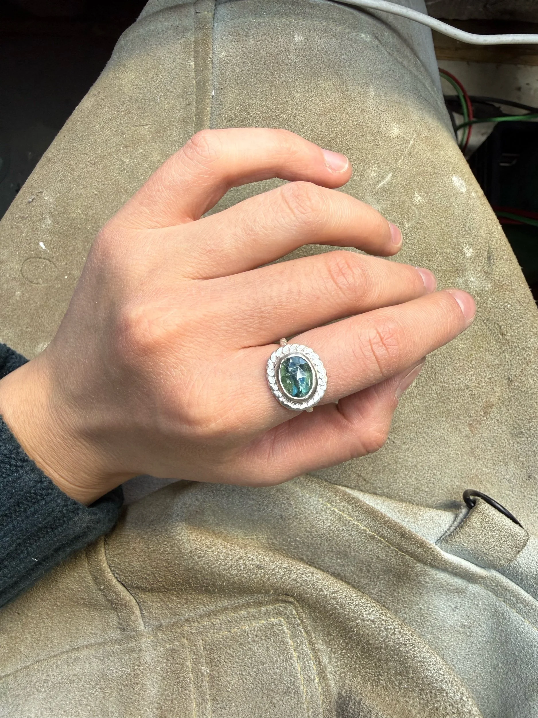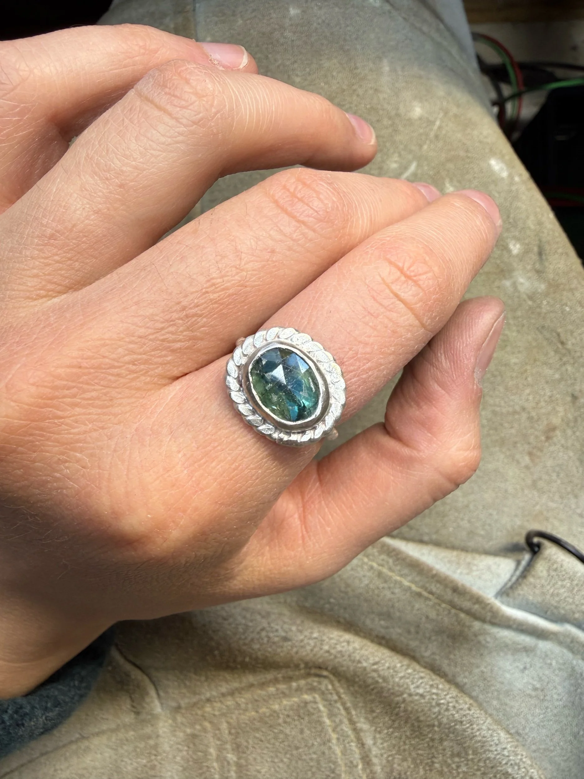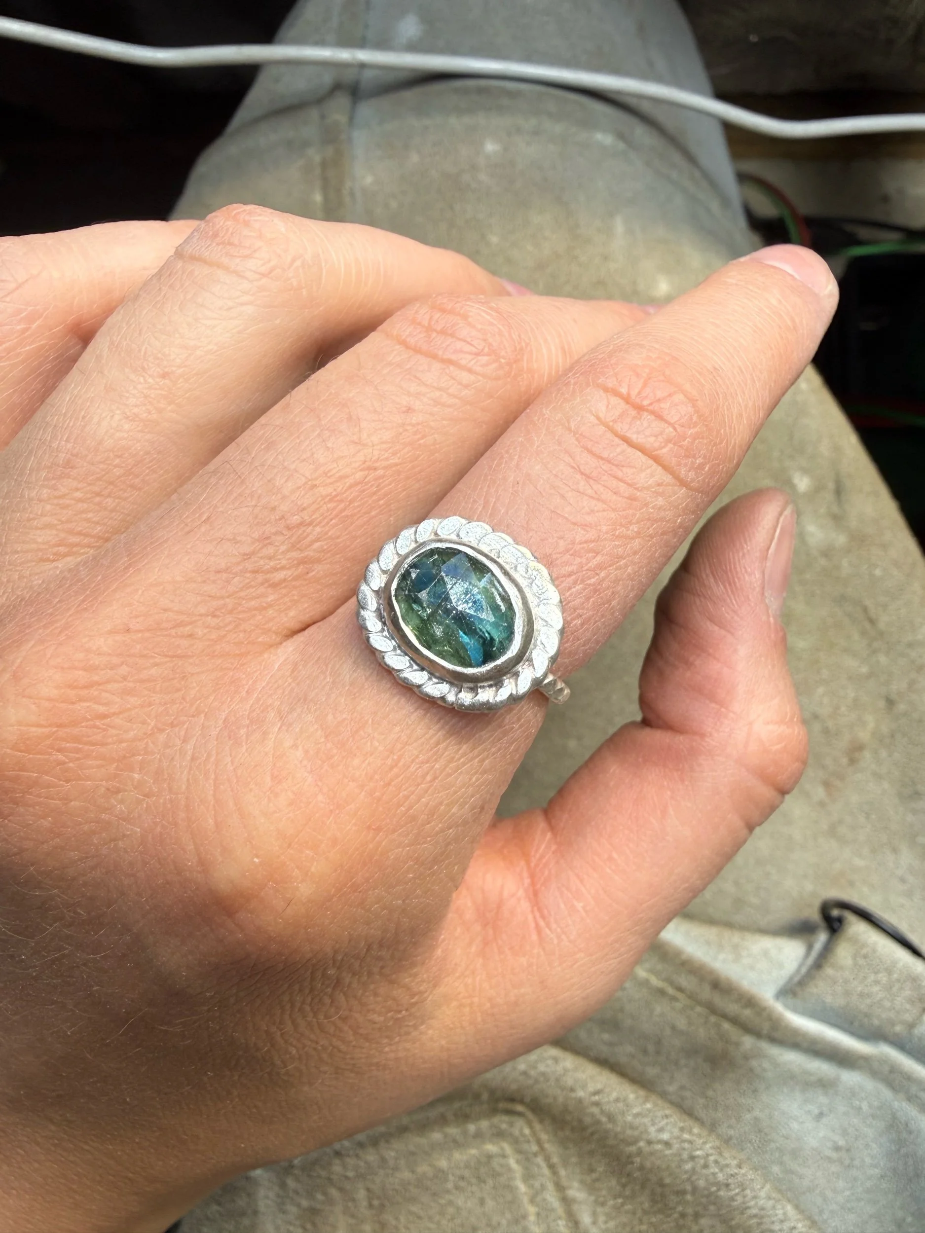 Shop › Kyanite Ring Image 1 of 3 Image 2 of 3 Image 3 of 3 Kyanite Ring $95.00 Size 8, twist band and twist border Add To Cart Added! Size 8, twist band and twist border