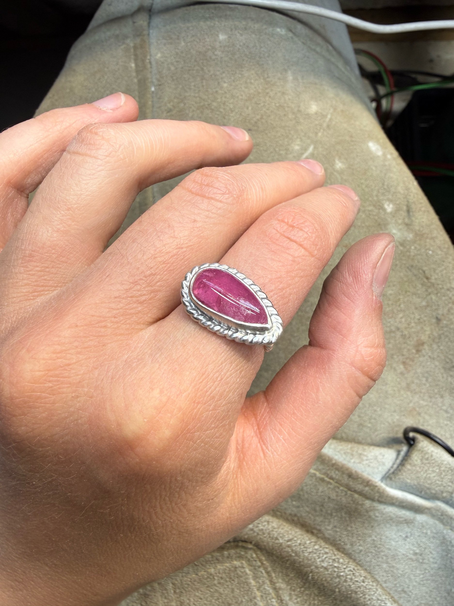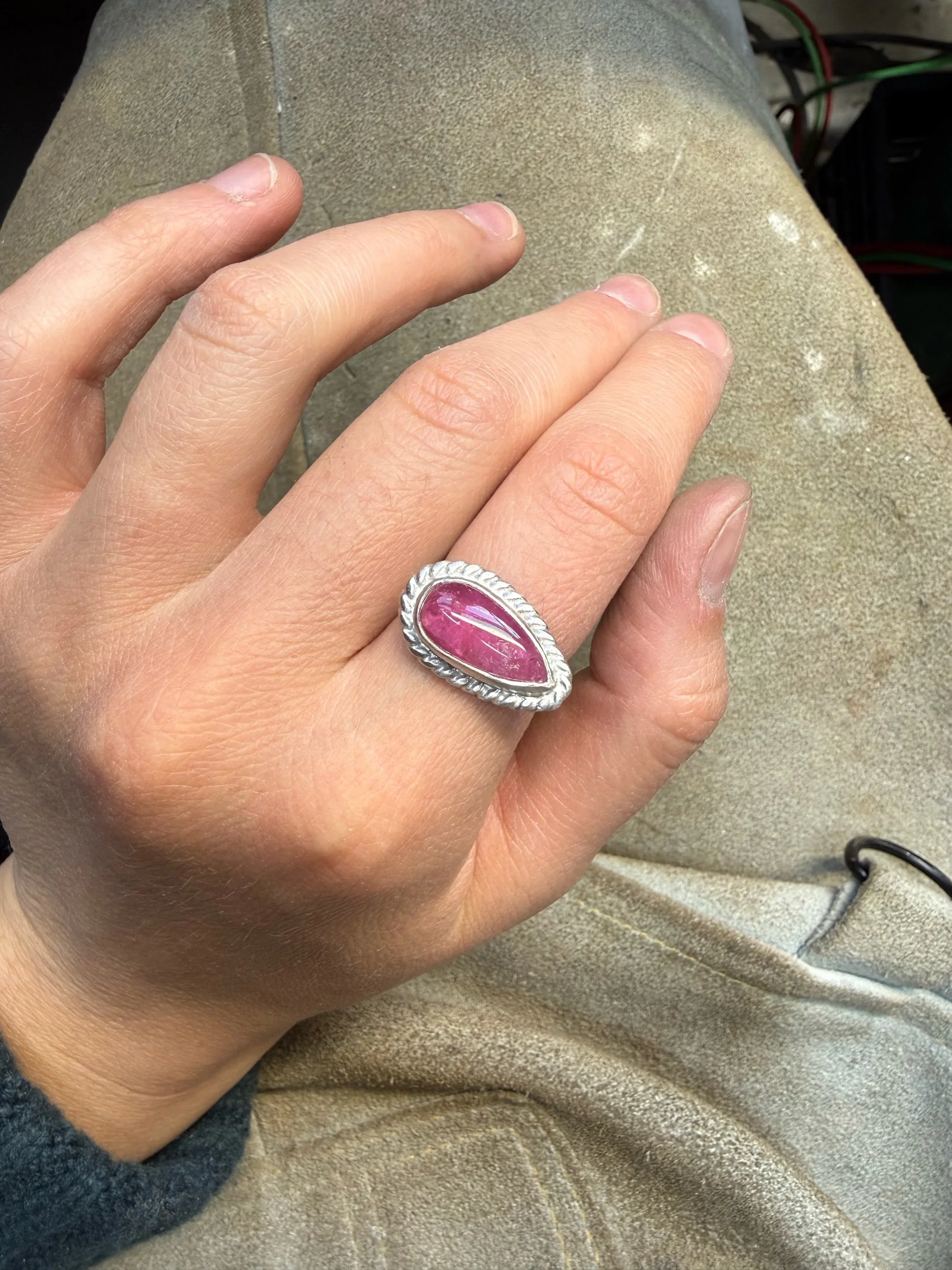 Shop › Tourmaline Ring Image 1 of 3 Image 2 of 3 Image 3 of 3 Tourmaline Ring $95.00 Size 7, twist band and twist border Add To Cart Added! Size 7, twist band and twist border
