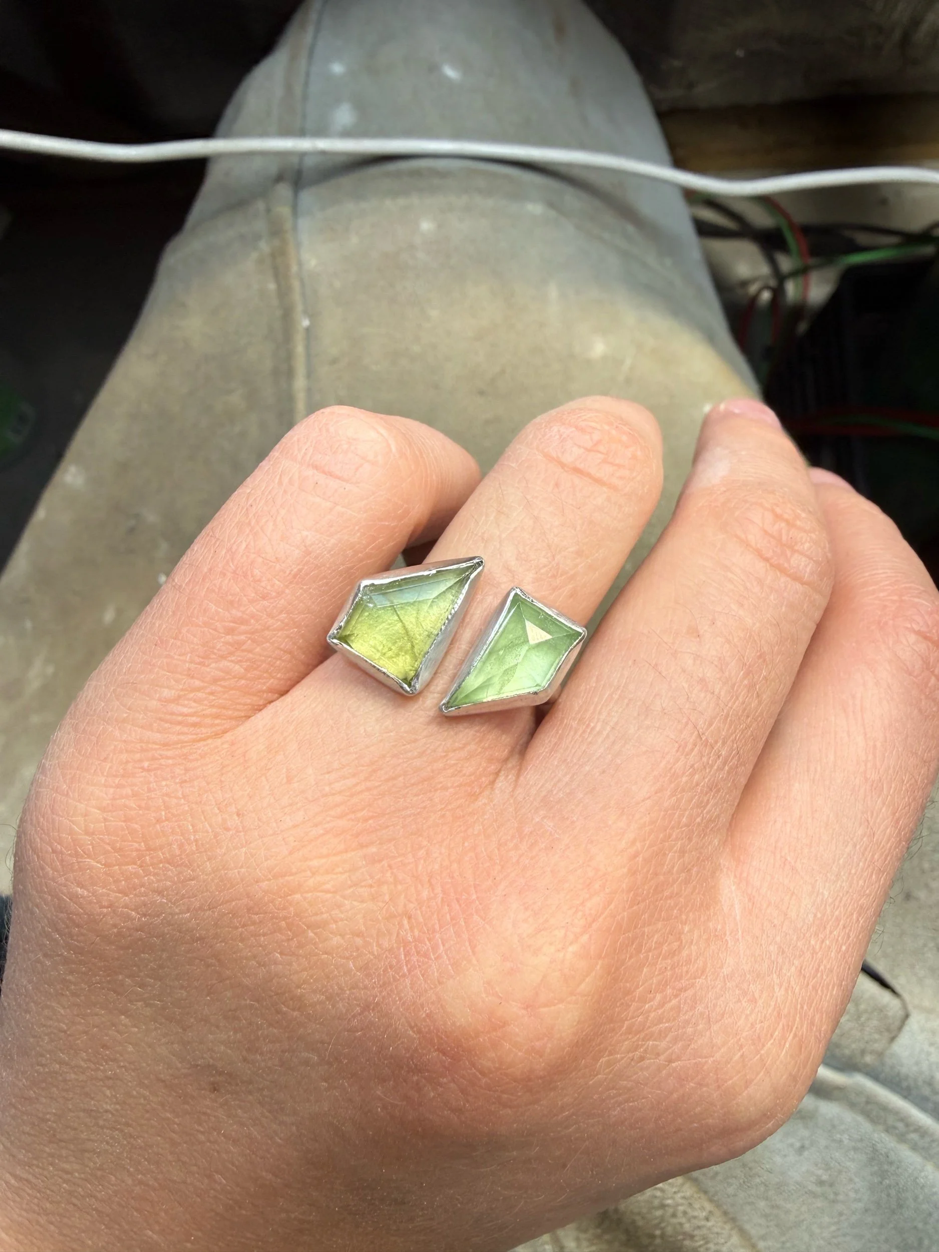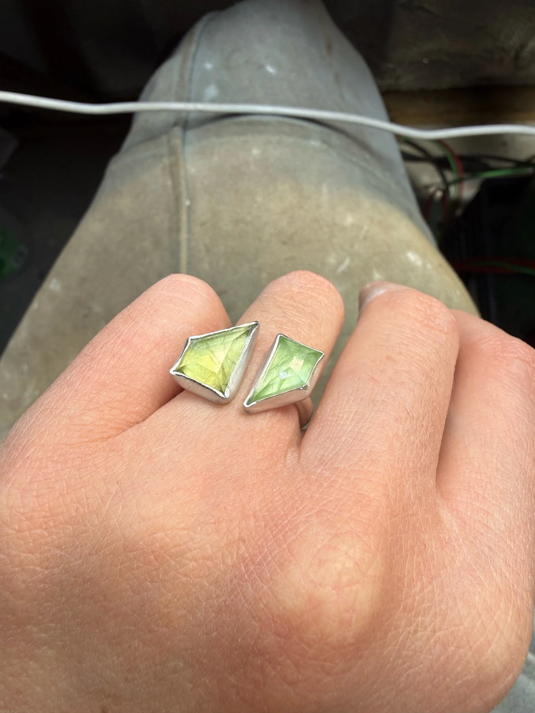 Shop › 2 Stone Peridot Ring Image 1 of 2 Image 2 of 2 2 Stone Peridot Ring $130.00 sold out Adjustable sizing but best first sizes 6-8. Sold Out Added! Adjustable sizing but best first sizes 6-8.